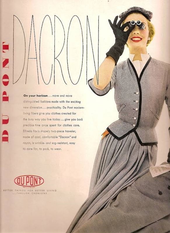 Synthetic fibers move from military needs into everyday life. Nylon, early polyesters, acetates enter stockings, dresses, linings, undergarments. Easier to wash, faster to dry, less prone to wrinkles — this is sold as part of the new happy life: home, refrigerator, automobile, and "wrinkle-free" fabrics.