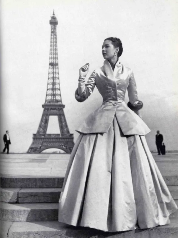 The women's wardrobe, by contrast, is initially rolled sharply backward — from the standpoint of freedom of movement. In 1947, Dior presents the New Look: a narrow, accentuated waist, a full skirt with enormous fabric consumption, soft shoulders, neat gloves and hats. After the war years, uniforms, rationing, and work overalls, this reads as a celebration and a return to "normal life." But at the same time — also as a return to an ideal where the female body must be composed, soft, "domestic," inscribed into the image of wife and mother.